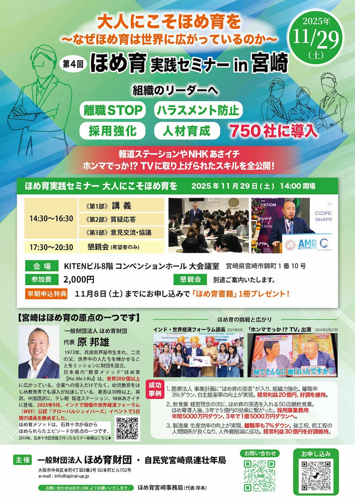 【セミナー】11月29日(土)ほめ育実践セミナーin宮崎『大人にこそほめ育を〜なぜほめ育は世界に広がっているのか〜』を開催 |